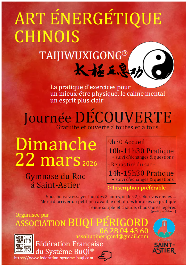 Voici la date de la prochaine journée de pratique ouverte à toutes et tous !!! Comme chaque année c’est l’occasion de faire connaître les Daoyin du Taijiwuxigong et d’autres pratiques associées au Système Buqi comme la méditation, Ba Duan Jin, Taiji 37 ou encore les daoyin de la montage E-Mei. Venez nombreux !